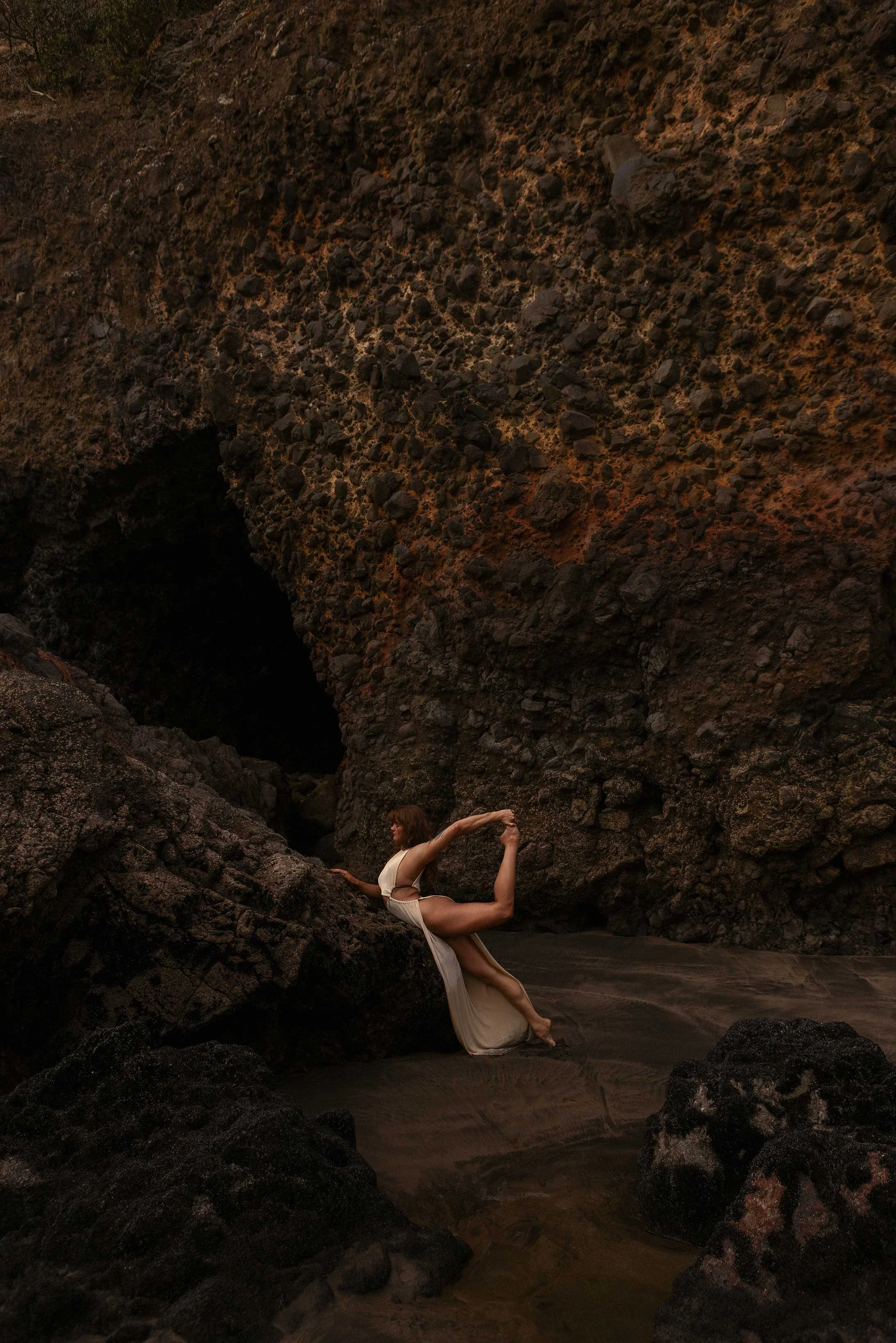 We planned our shoot to coincide with the new moon, making it feel quite magical. Amy took me to a unique spot on New Zealand’s West Coast—usually underwater but accessible only during a new moon at low tide. I’d never been there before, and being in that quiet, hidden place by the ocean felt truly unforgettable.